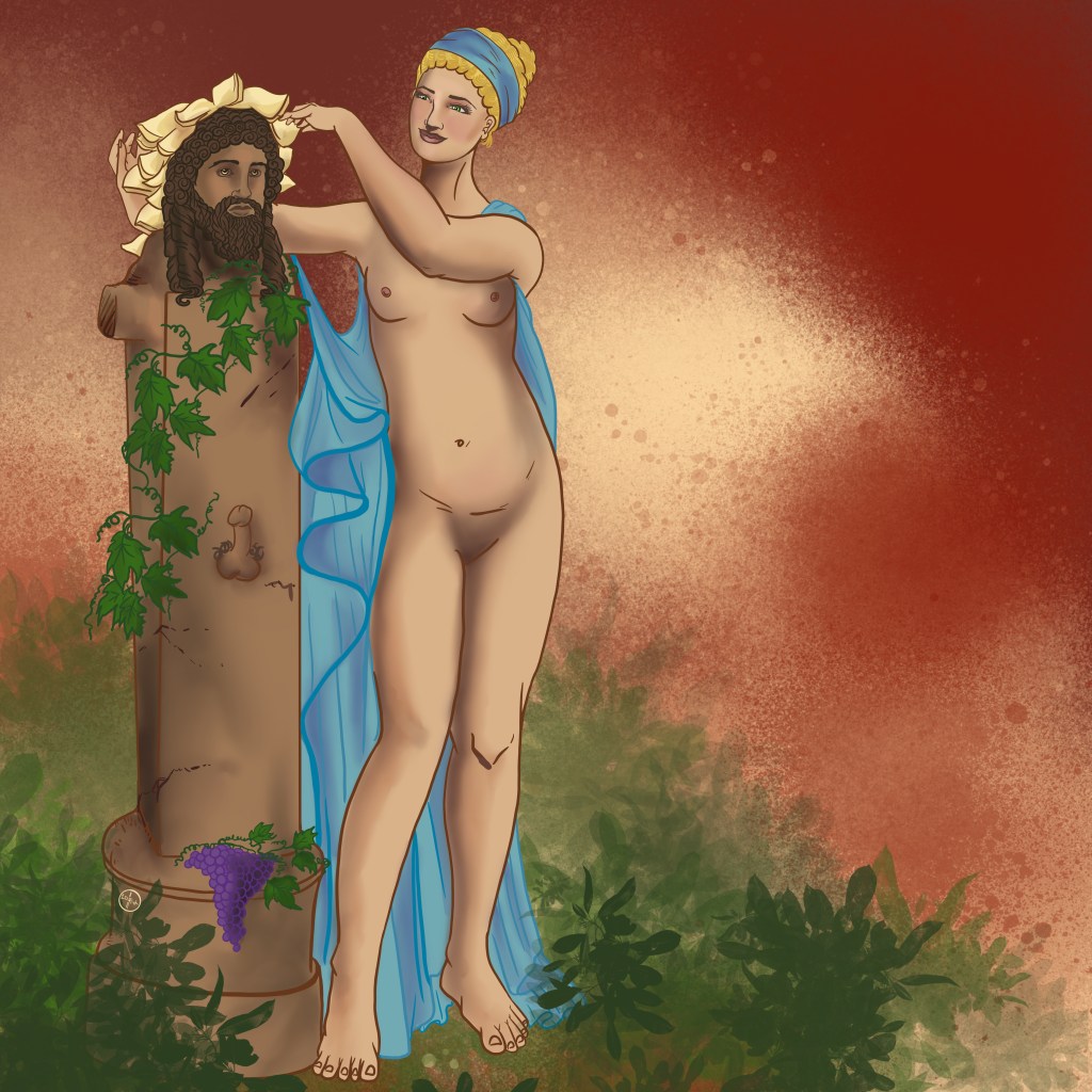 Illustration of Aphrodite garlanding a herm of Dionysus based on a terracotta figure from Asia Minor, c.100 BCE. Source: Z. Guertin.