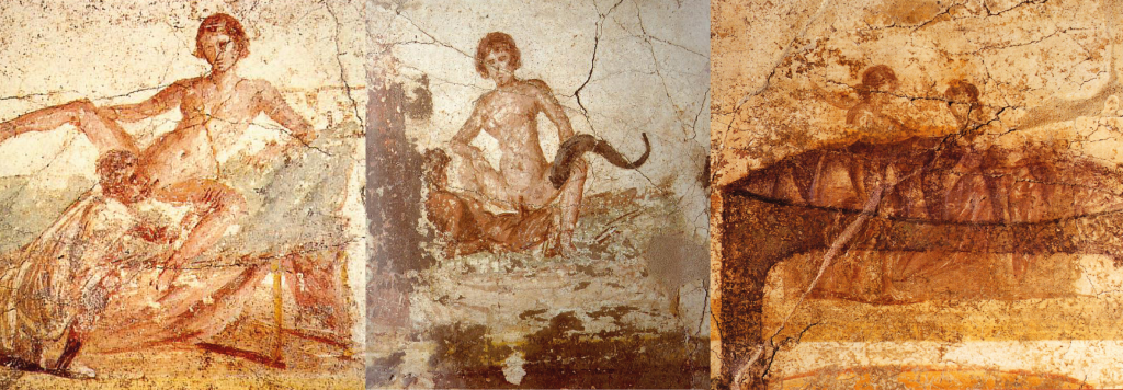 A large array of painted sexual acts were found in a brothel and bath complex in Pompeii and are now displayed in this exhibition space. The contexts of these images make understanding their viewership important. One can assume that erotic decoration in a brothel could serve as advertisements of services the sexworkers offered, material to get clients in the mood and so on. Whereas, the erotic paintings in the Suburban bath complex were used as decorations for clothing cubbies. Each place to store belongings had a different sex-act which ranged from partnerships of homosexual and heterosexual pairings to multiple partners and positions. It should be noted that the frescoes had been painted over at some point before the eruption of Vesuvius in 79 CE, but it is unlikely that they had been covered for that long. The erotic bath complex art would have been for a broader viewership than the similar themed and sized frescoes in the brothel. Both men and women from all social classes used the public baths, though probably at different times of the day in most cases. Visitors to the baths could purchase gratification from sexworkers there as well, but it cannot be assumed that this was the primary purpose of those images. Humour, aid-memoires and many other culturally relevant possibilities could account for decorating a public bath changing room with graphic sexual images (Vout 2013, pp.13-14).