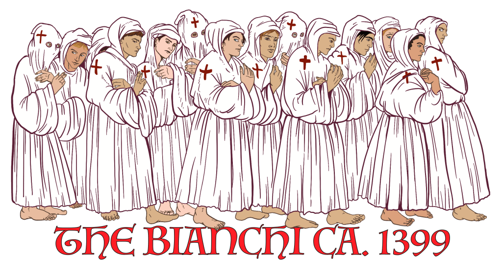 The foundation story of the Bianchi movement has a few sources, but one is the the ‘tre pani’ story, discussed in greater depth here on Dr Lee’s website, taken from the account of Luca Dominici, a chronicler from Pisotia. In the story, a labourer is working minding his own business when an elite looking fellow (Jesus) shows up and asks for food which the labourer does not have. Miraculously, Jesus has him open his jacket to find- lo! bread! Jesus then asks the labourer (witness) to moisten the bread with water, which again, is not available but with some cajoling, the man go out looking for a fountain which was previously not there, to find a white-robed woman (the Virgin Mary) trying to convince him to not dip the bread. The labourer is ping-ponged between the two for a bit then ultimately does dip the bread, which spreads the pestilence. It seems like entrapment since the poor man didn’t know who they were and was just following hospitality norms but hey ho. The plague is released, but why? Effectively, the pestilences that humanity faced in this period were because Jesus was angry about the high levels of sinning, so decided to destroy mankind. Seems fair.